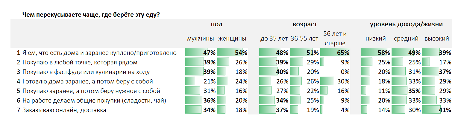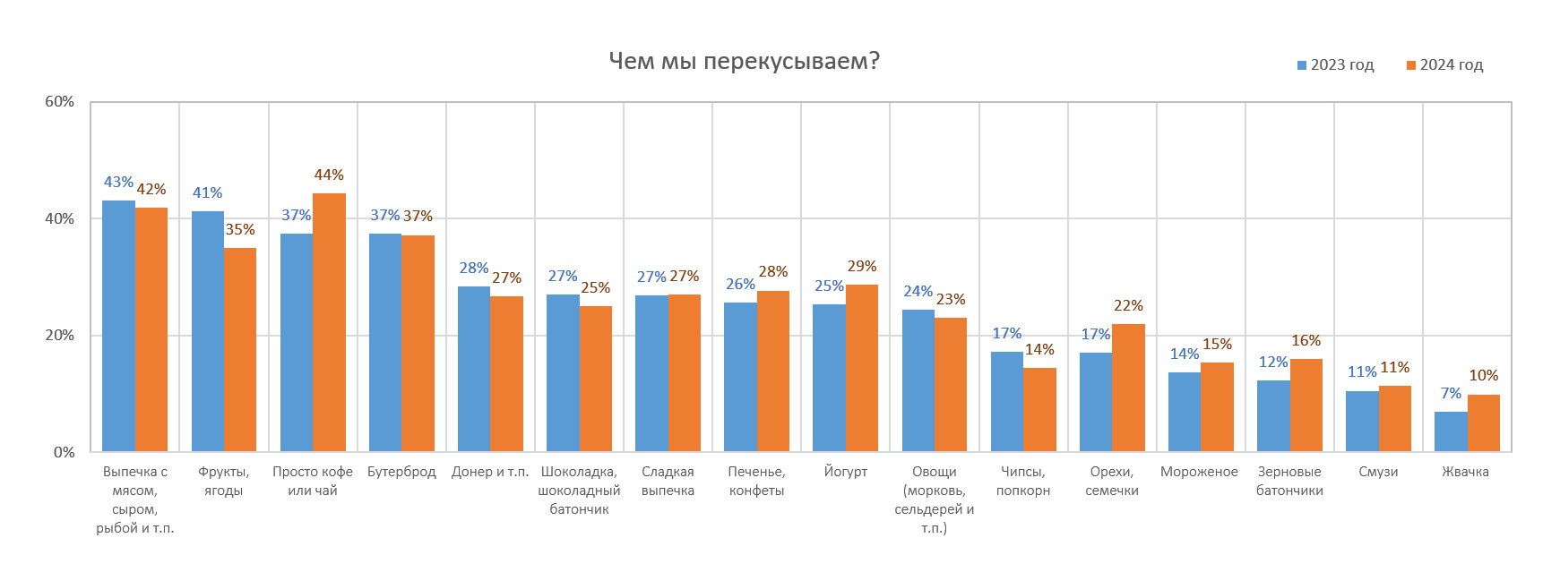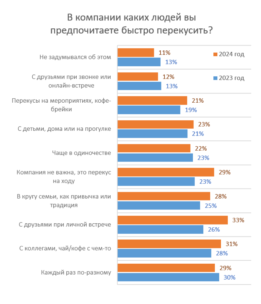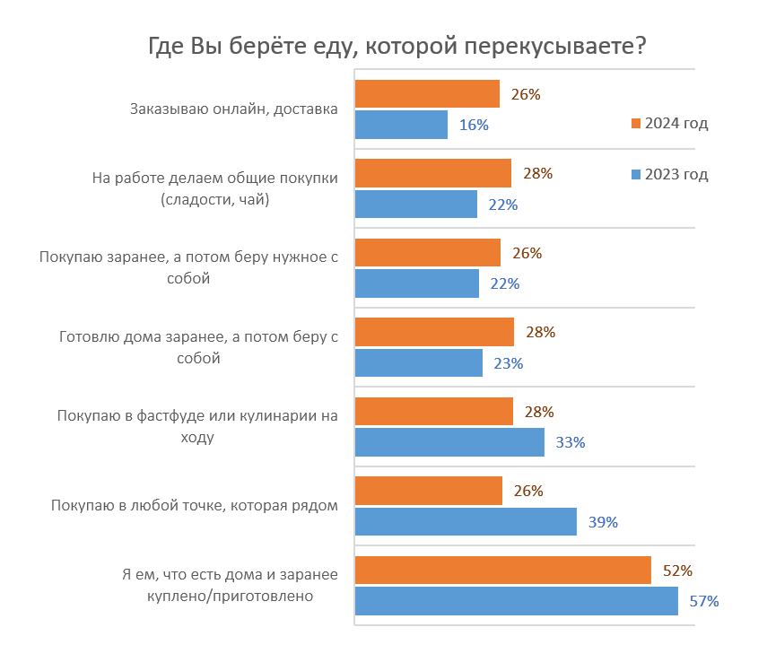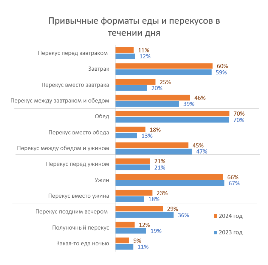 Мы считаем, что, отслеживая изменения в формате еды и перекусов, можно подмечать неочевидные на первый взгляд тенденции и некоторые аспекты В2С рынка; использовать «еду» как индикатор социального настроения и потребительского поведения общества; спрашивать людей не о больших и важных вопросах, а о привычном и ежедневном. Повторяя данный опрос несколько раз (это вторая волна, первый опрос прошел в 2023 году, в планах уже 2025 год), мы анализируем изменения, отслеживаем зависимости, тренды, тенденции. Получился увлекательный исследовательский эксперимент.